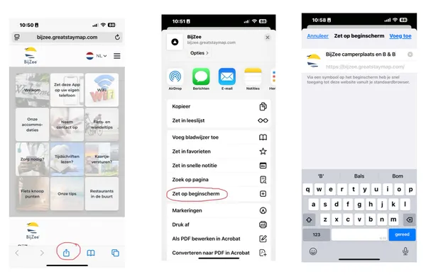 Wilt u tijdens uw verblijf bij ons alle informatie makkelijk kunnen vinden, zonder steeds de url op te zoeken? Sla deze website dan op als app. Met één druk op de knop heeft u dan toegang tot alle tips van Bijzee. U hoeft geen extra app te downloaden, het is slechts een 'foefje' om snel naar onze speciale website te gaan.